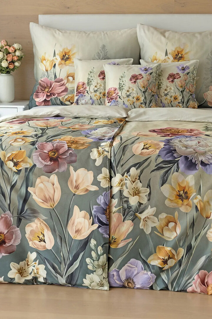 S povlečením Elara vaše ložnice rozkvete do krásy. Barevné květy vlčích máků vynikají na modrozeleném podkladu, který přechází v horní části povlečení do tlumeného zelenošedého tónu. Díky nejmodernějšímu digitálnímu tisku vyniká květinový vzor v prec