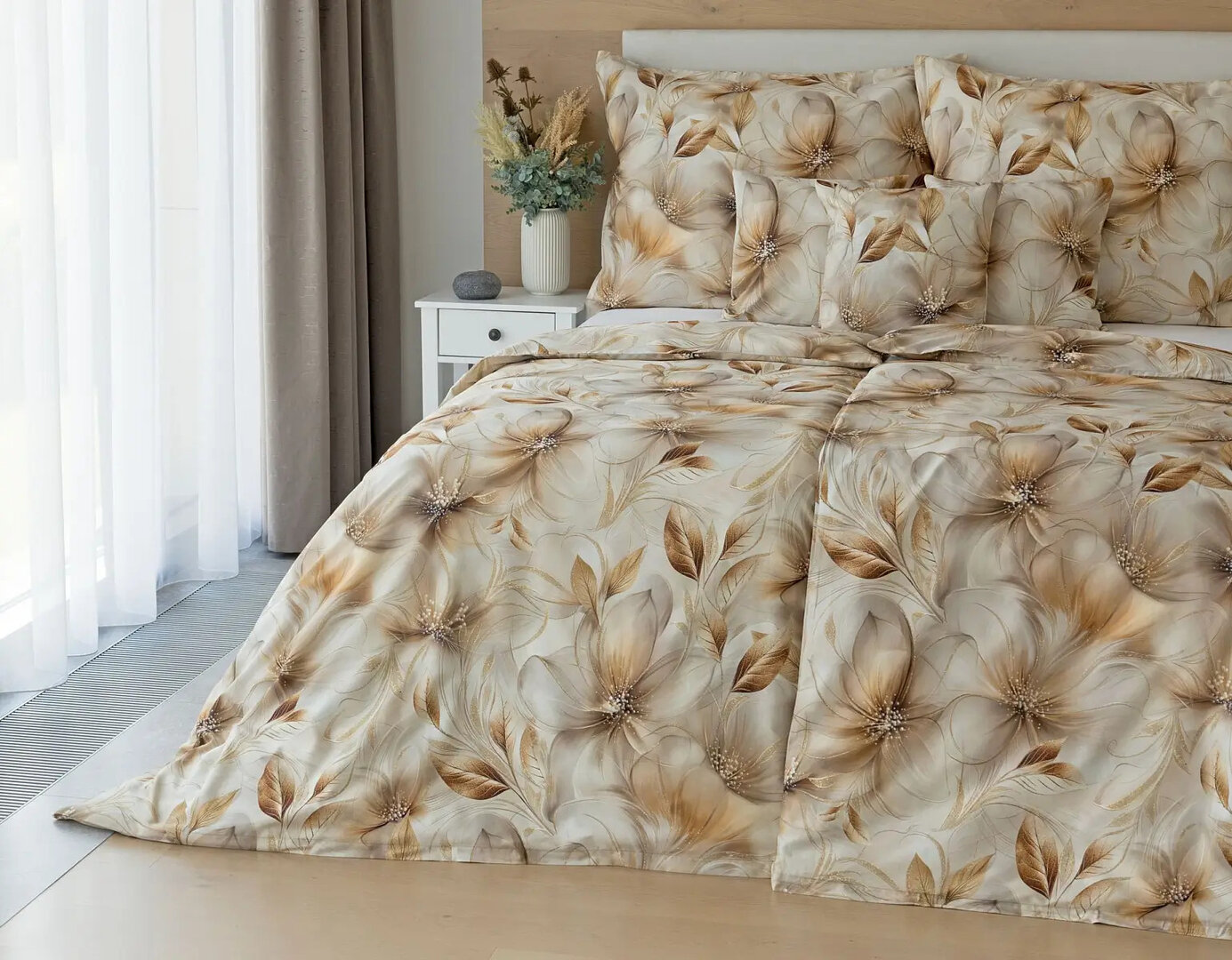 Nesmírně elegantní a poutavý vzor přináší bavlněné povlečení Armide z naší nové kolekce. V propracovaném květinovém motivu se prolíná paleta přírodních béžových a hnědých tónů protnutých zlatavými prvky
