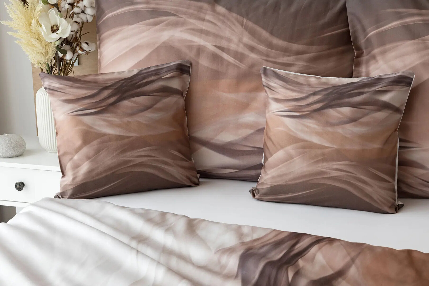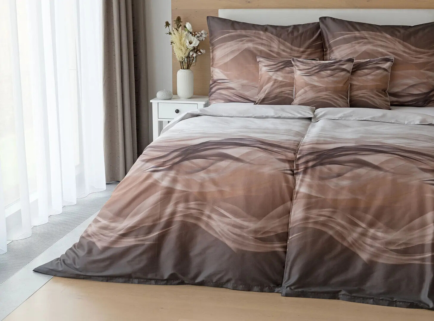Abstraktní motiv kombinuje oblíbenou paletu přírodních béžových a hnědých tónů, které navodí v ložnici útulnou atmosféru. Eleganci podtrhuje jemný lesk bavlněného saténu, který je pro tento vzor jako stvořený.