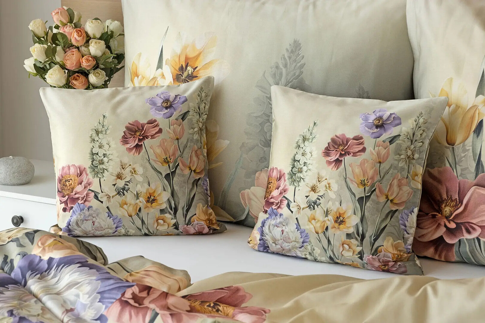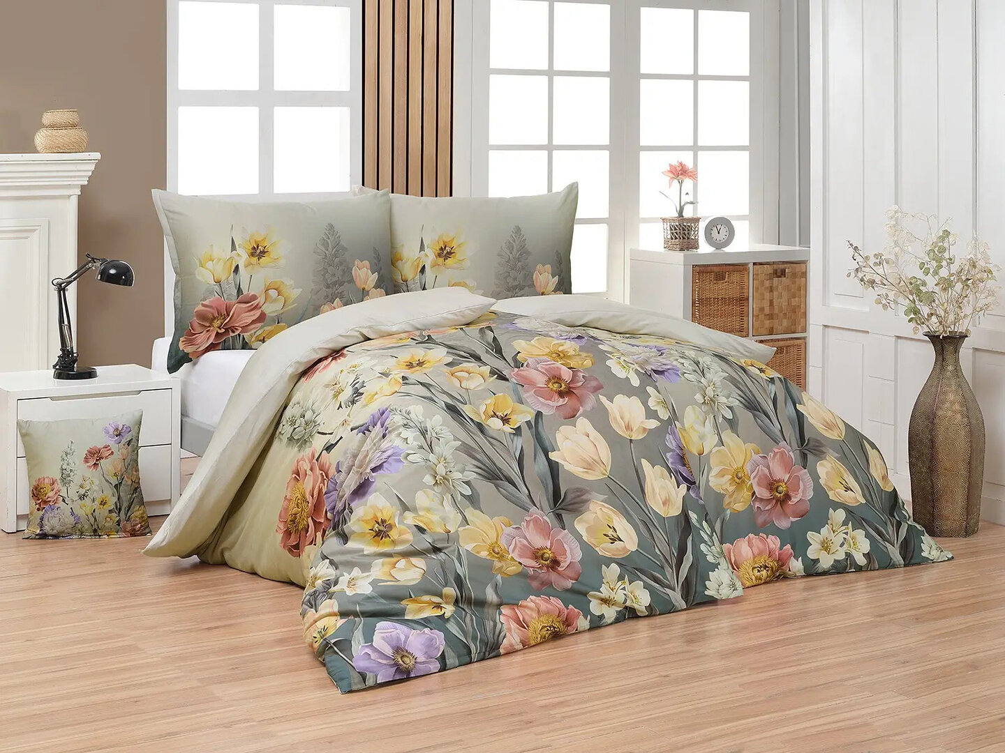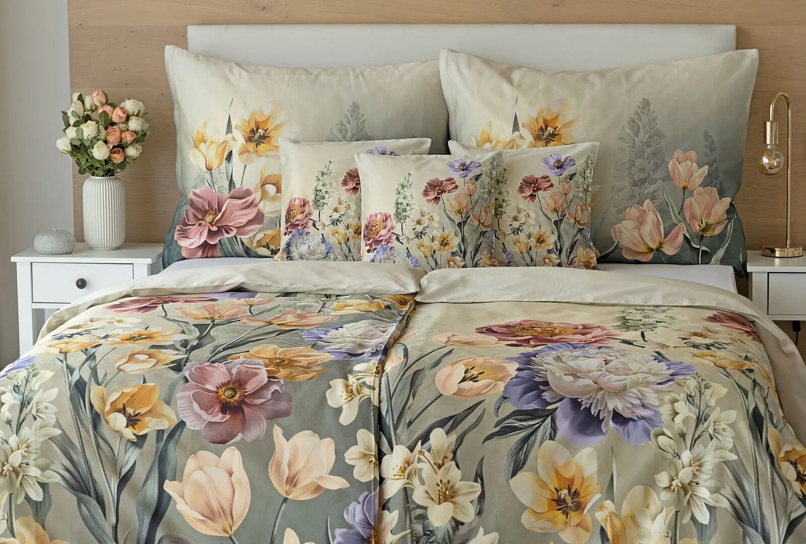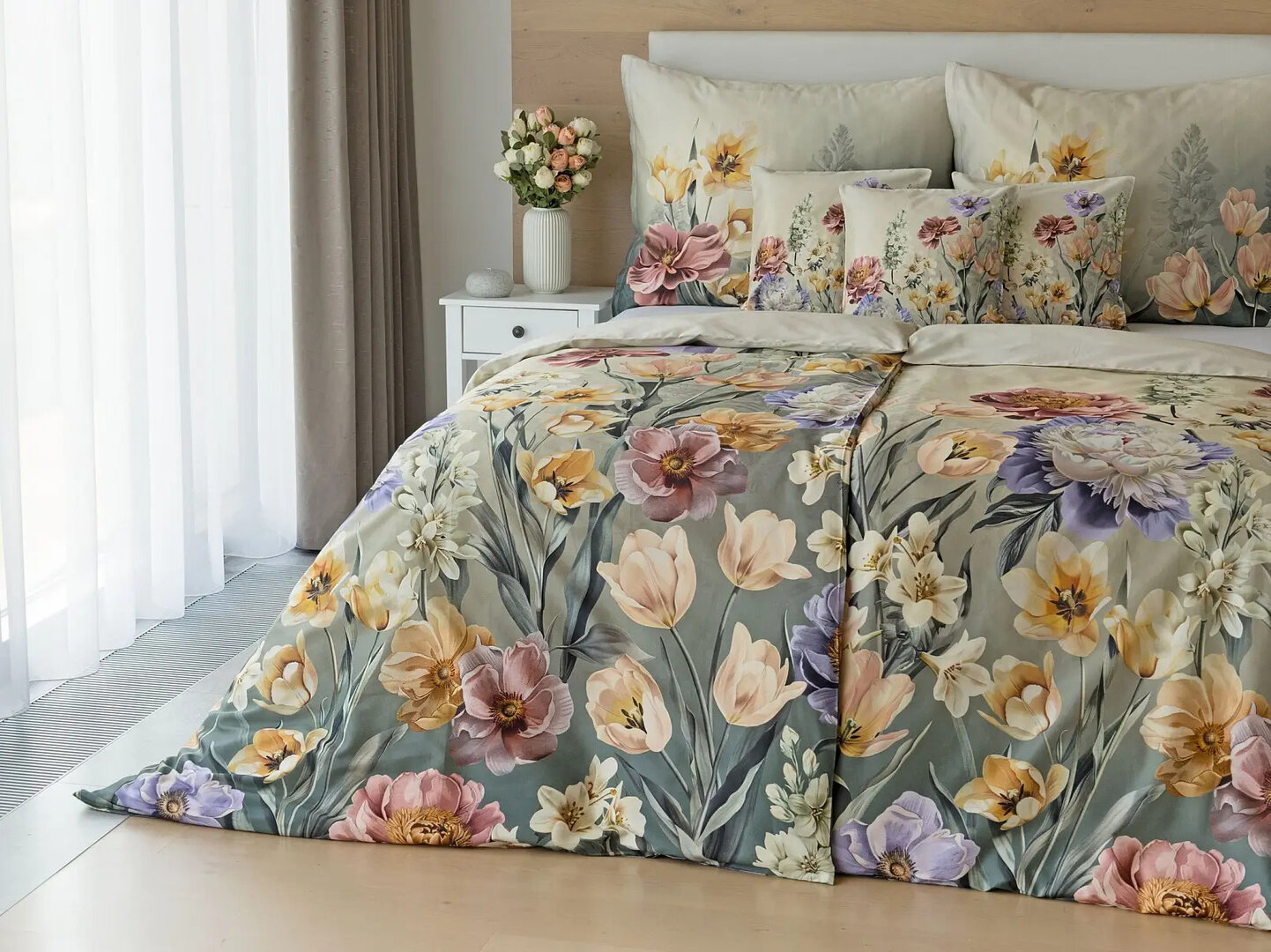 Se saténovým povlečením Elara vaše ložnice rozkvete do krásy. Barevné květy vlčích máků vynikají na modrozeleném podkladu, který přechází v horní části povlečení do tlumeného zelenošedého tónu.