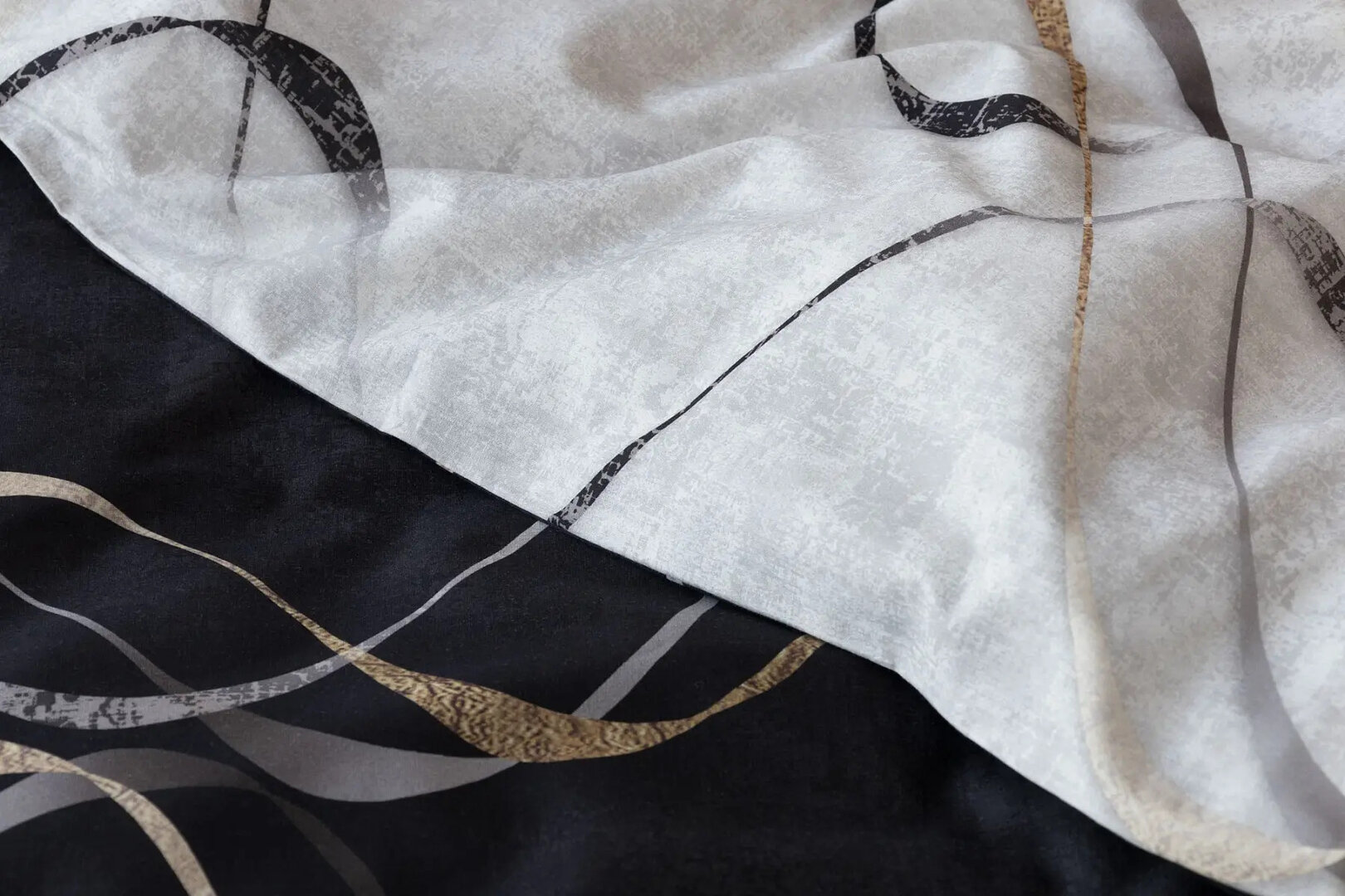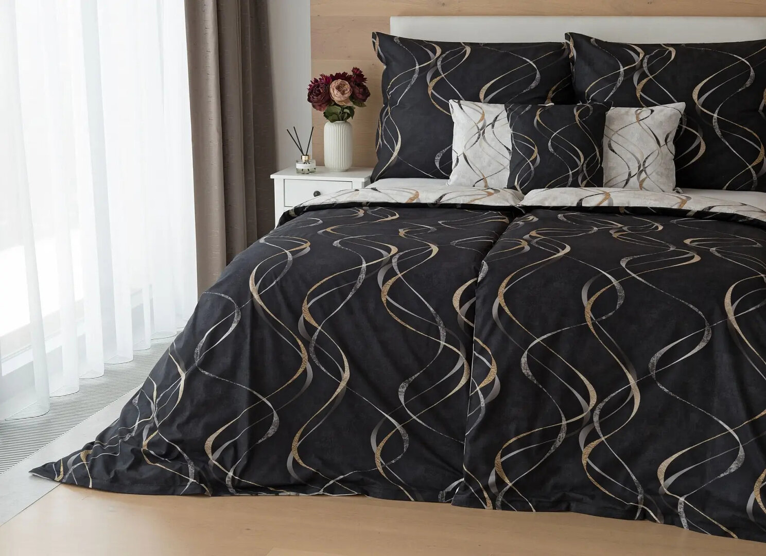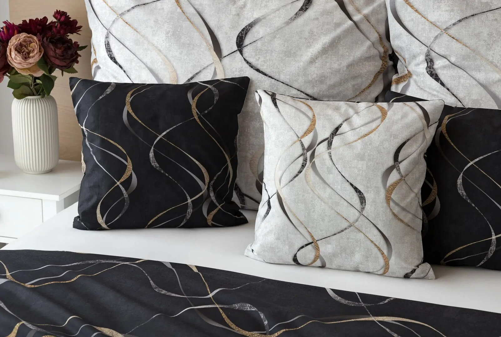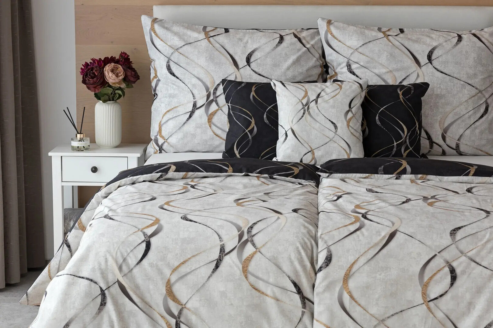 Oblíbené oboustranné provedení vám umožní jednoduše změnit vzhled interiéru, aniž byste museli nutně převlékat. Jednoduchý motiv zvlněných šedozlatých linek se prolíná na černém a světle šedém podkladu. Originální vzhled vzoru podtrhuje tzv. Grunge textura, která vyniká díky preciznímu digitálnímu tisku.
