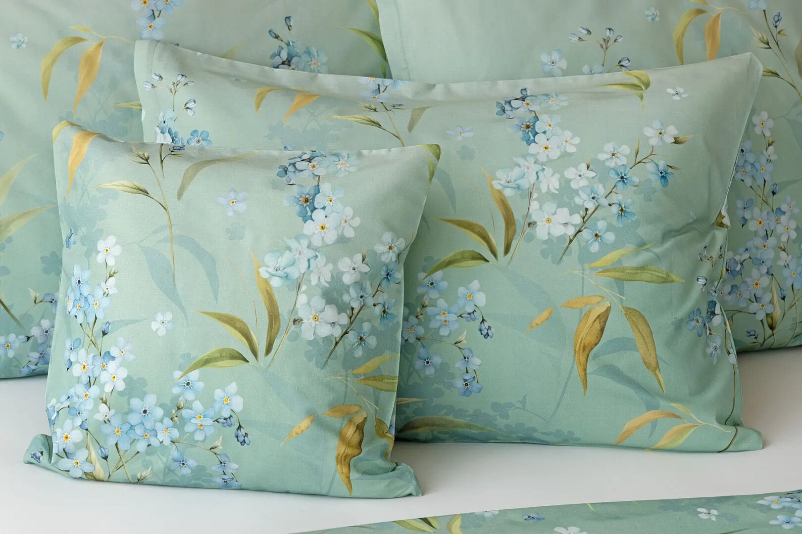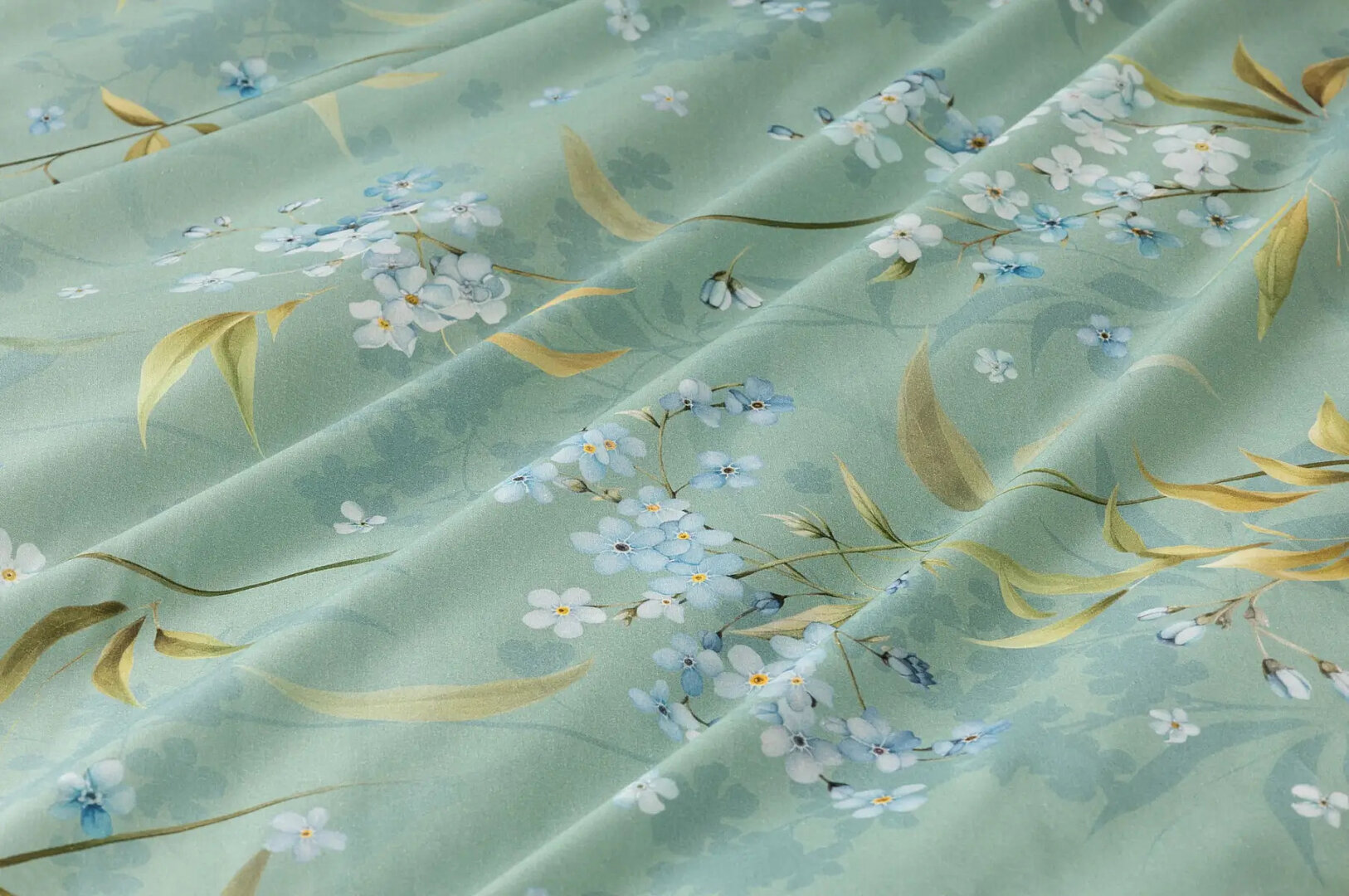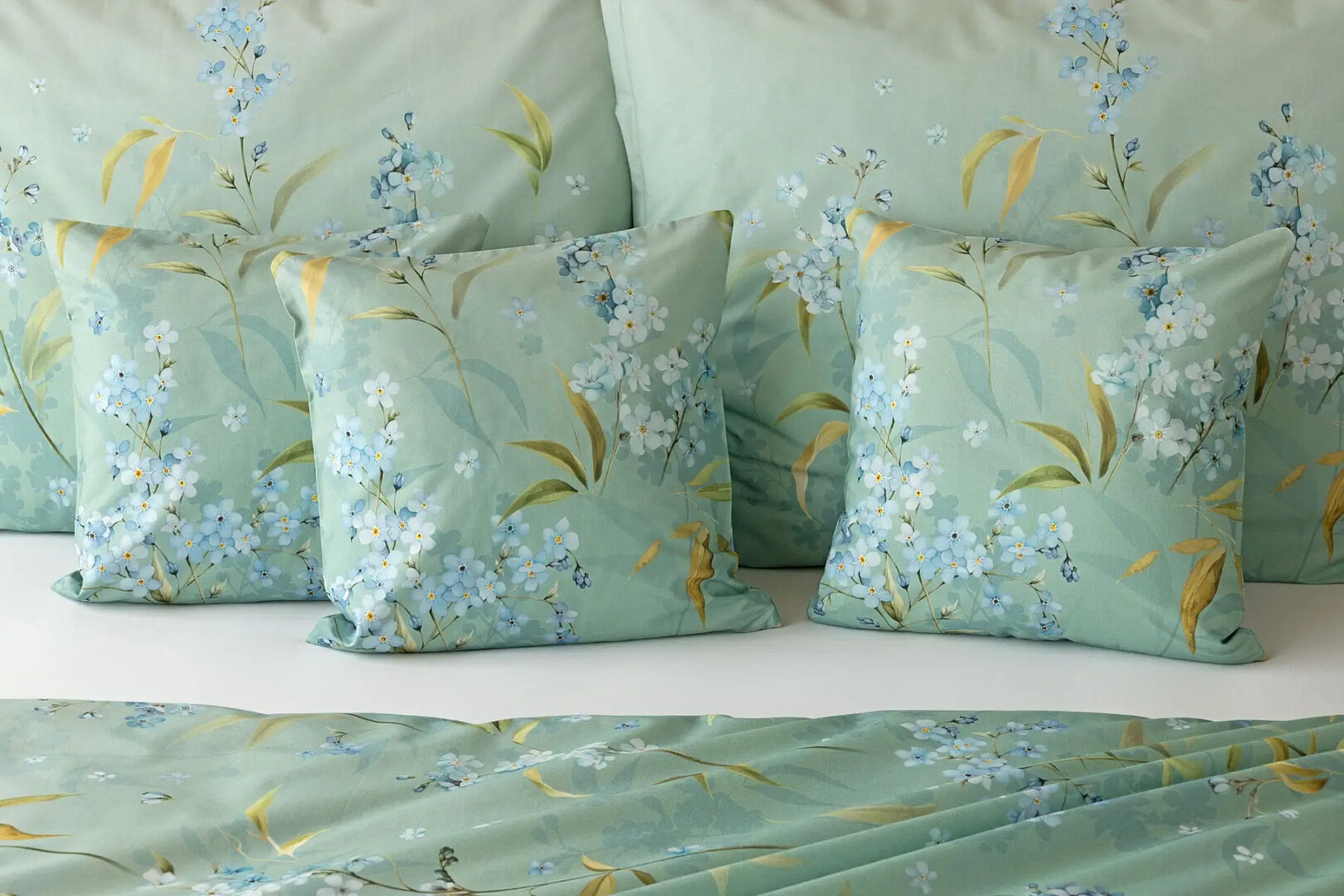 Něžný motiv pomněnek je v dokonalé harmonii se zelenomodrým podkladem, který je navíc ozvláštněn ombré efektem. Tento něžný květinový skvost si zamilujete.