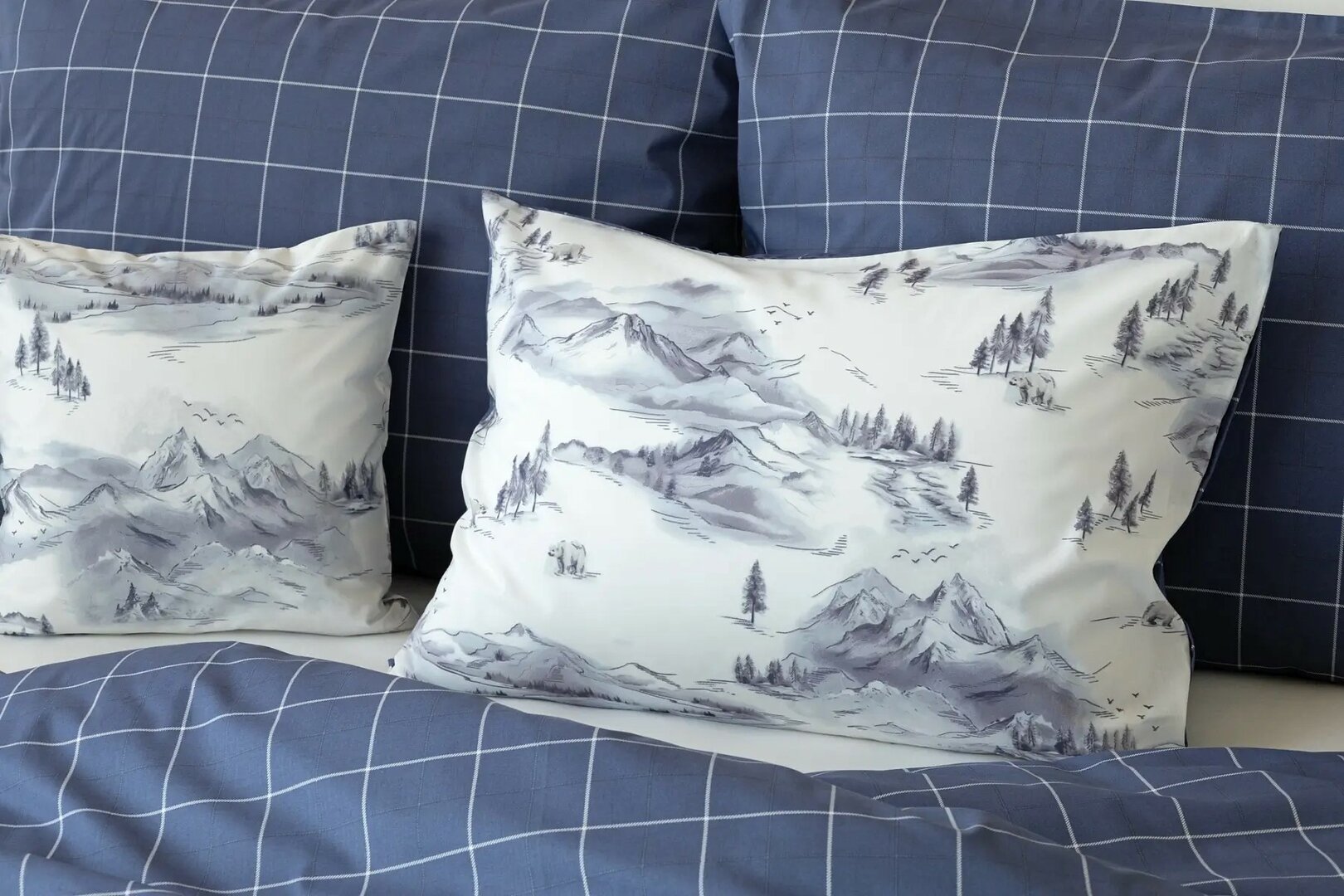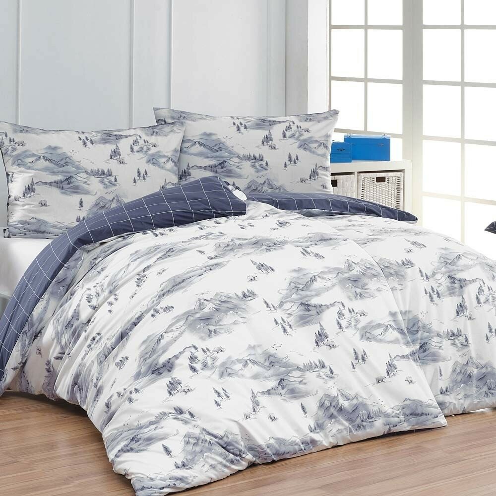 Vrchní stranu povlečení zdobí kresba horské krajiny v paletě modrošedých tónů na sněhově bílém podkladu. Spodní stranu tvoří kostka s bílou konturou na modrošedém podkladu. Díky tomuto oblíbenému oboustrannému provedení můžete při stlaní hravě experimentovat!
